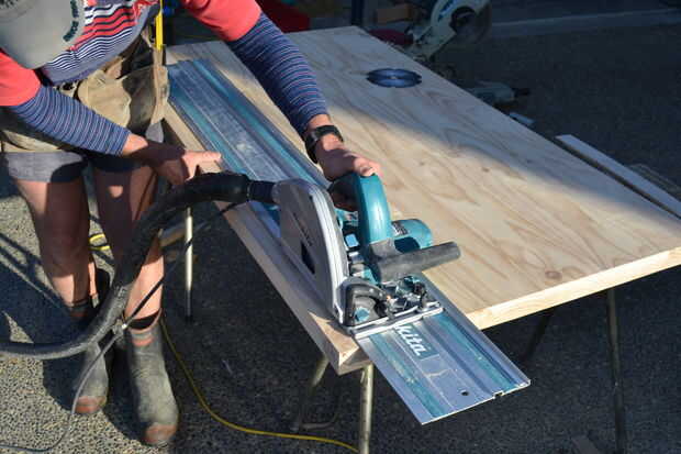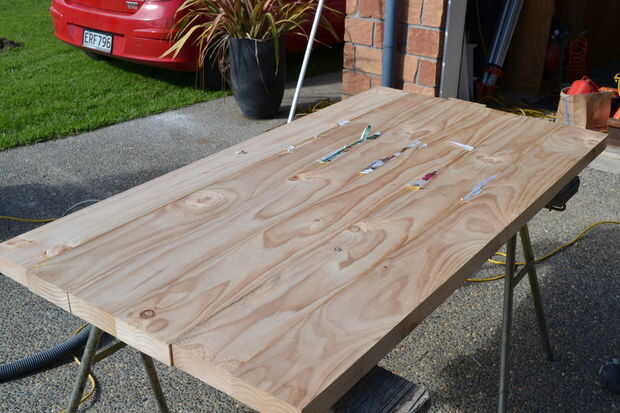 4 1/2 por 2 1/2 pieza de maderaMuchas piezas de madera que puede ser cortado para ser utilizado como fronteras, apoya por debajo de la mesa y un contorno en la parte exterior de la tabla.Sierra para cortar maderaPistola de clavosLana y poliester fiel