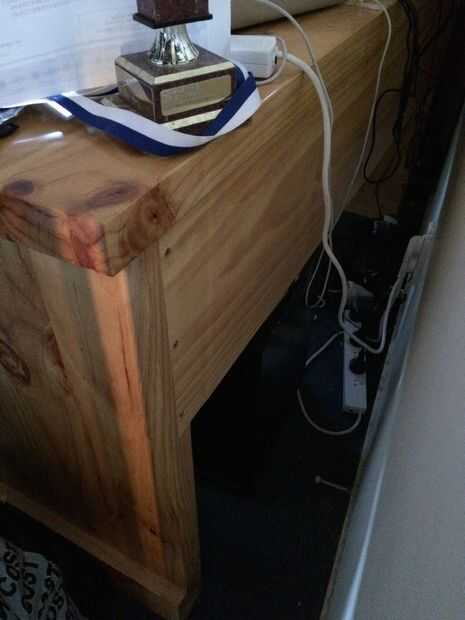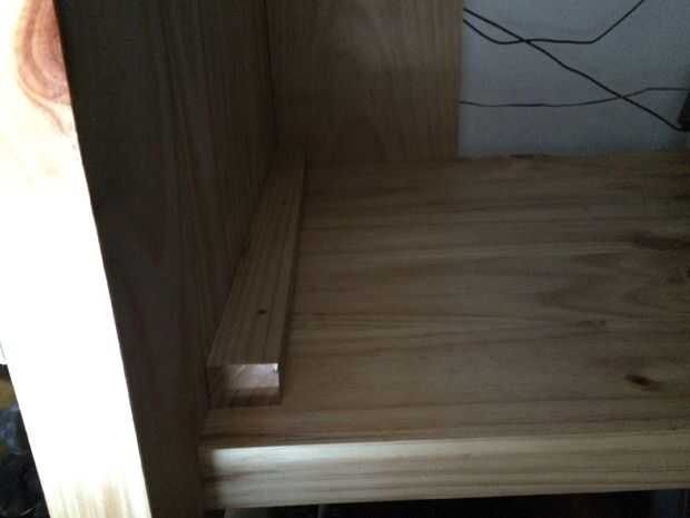 las muescas enrutadas para las piernas no es suficiente para mantener estable el escritorio para que un pedazo de madera se pega entre las piernas en la parte posterior. también un bloque de madera se atornilla en el lado interno de la pierna que se apoya contra la parte superior.