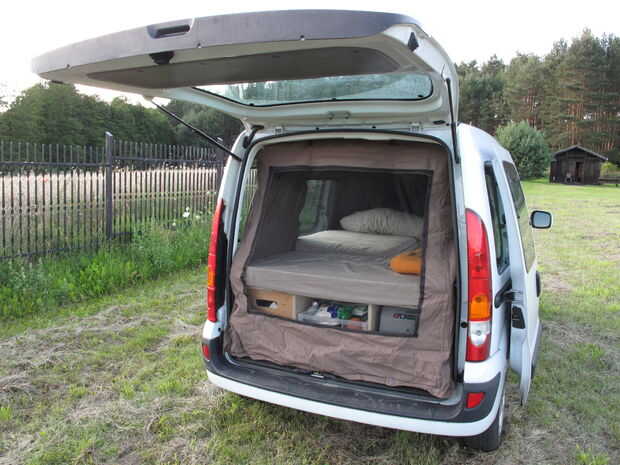 Si deseas viajar por un país con un presupuesto y aún dormir en un lugar seco y cómodo, aunque llueva, una pequeña caravana perfecta de es. Pecado embargo, yo lo tener un coche consumiera poco combustible que también pudiera usarse diariamente. Elegí un blanco Renault Kangoo 1.5dci, una mini furgoneta de segunda mano. Tiene un rendimiento, de cuanto en combustibles usa (5.2 L/100 km, una autonomía alrededor de 1.000 kilometros), es agradable de conducir, y se sacan los asientos cuenta con un espacio de carga sorprendentemente grande para el uso deportivo/cotidiano.