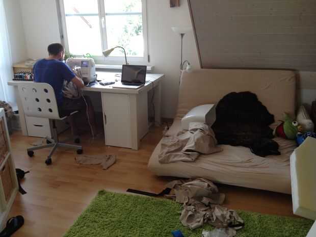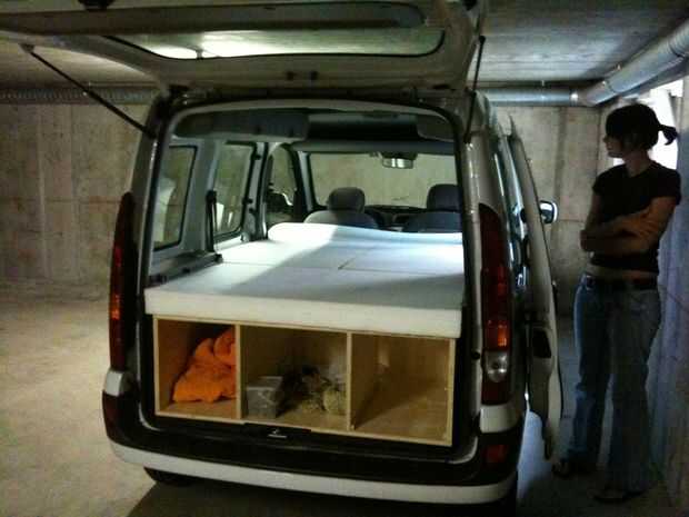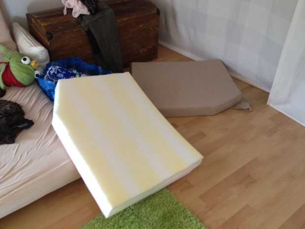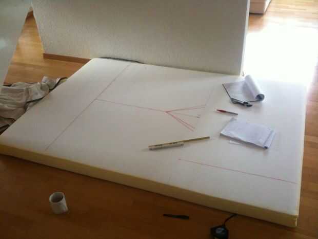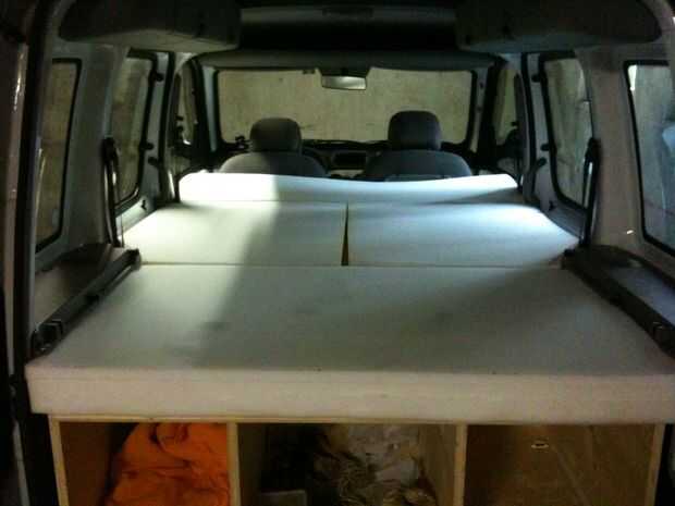 Usamos un colchón de Ikea (1.4mx 2 m x 0,1 m) y lo cortamos en 4 piezas. La pieza trasera cubre la caja trasera. Las piezas medias hijo modelo más anchas la caja trasera para hacer un poco más ancha la plataforma de dormir. Cubiertas tienen se pueden todas las del cliente retirar lavadas de ser para (fueron cosidas en la máquina de coser de mi novia). Las dos piezas medias se conectan con una cinta de velcro asegura se separen durante la noche. Durante el día, la pieza media que no se usa se puede poner encima de la otra pieza media o ser utilizada como un almohadón, mientras descansas en el "sofá".