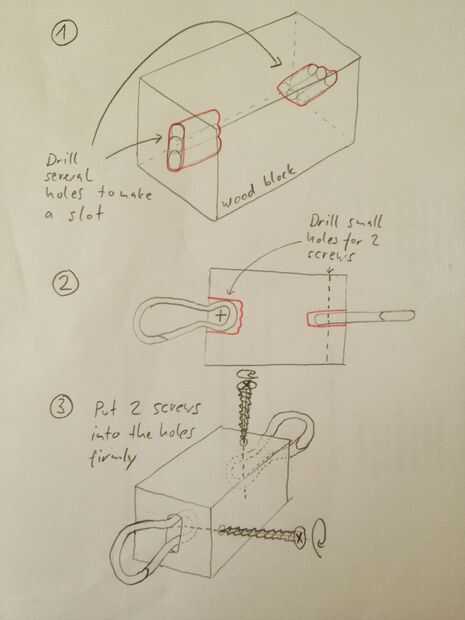 Se trata básicamente de una pieza de madera con dos agujeros en los lados. Dos mosquetones se meten tornillos de la con en los agujeros y se sujetan.