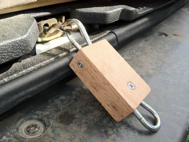 Asegúrate de comprobar tipo de cerradura se usa para la puerta de atrás de tu coche. En mi caso, el mosquetón coinciden con el tamaño del aro de metal que se puede ver en la imagen. Debido a esto, el mosquetón en el extremo de la puerta puede sujetarse al mecanismo de cierre y hacer la puerta quede bien cerrada. Para abrirla de nuevo, solo hay abrir la puerta y usar el mango de la puerta como lo haría pecado el espaciador. Dado el espacio es lo suficientemente amplio como para permitir el aire especie, pero lo suficientemente pequeño como para prevenir alguien se meta la mano adentro, el espaciador te permite respirar y estar seguro durante la noche. :)