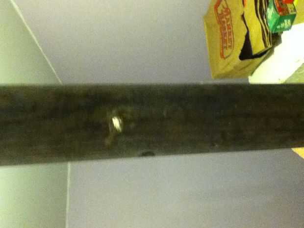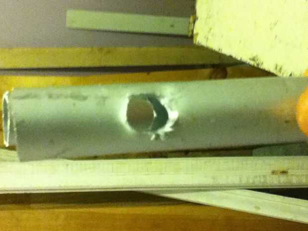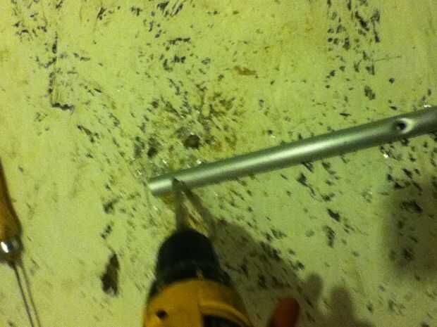 Primero la muleta. Marca donde quieres que tu agujero, fijarlo a la tabla y que vuelen con el taladro! Espero que todavía tiene sus gafas de seguridad, ya que este paso es un desorden. Será tomar un poco para que coger y morder el metal de la broca, así paciente e ir poco a poco.