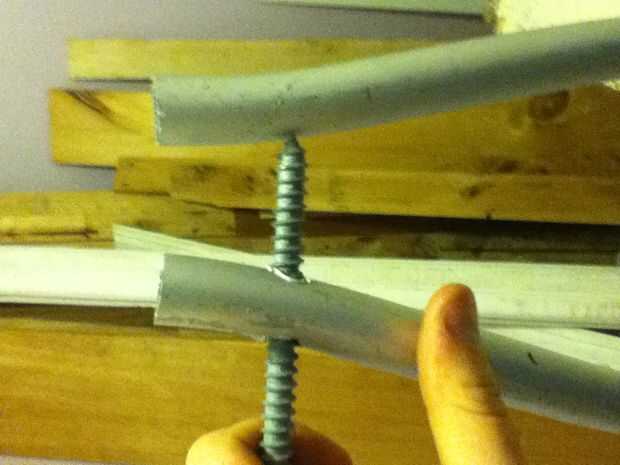después de la primera perforación, hacer otro agujero en el mismo lugar que en el primer hoyo. después de todo la muleta se perfora, hacer lo mismo a los zancos.
