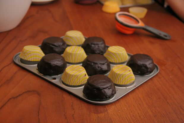 La parte inferior de su mini bollitos con papeles pintados/capa de la línea. (Eso es que estamos usando la parte de abajo!) Ahora moldear la masa en los trazadores de líneas. Alternan la masa para las galletas algún respiro para que las tazas no se peguen juntos.