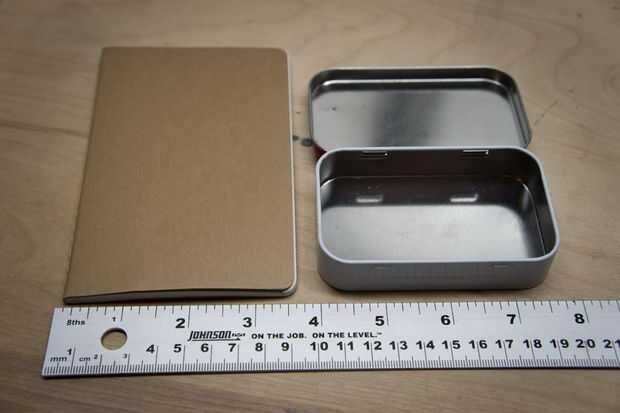 Compro mis moleskines en un paquete 3 "barato". Son la versión de la cubierta suave de tamaño bolsillo. Para encajar en la lata hay que cortar el libro. La bonificación de este es que ahora puede conseguir 2 cojines más pequeños por libro... el área de la escritura se reduce a la mitad tho así somos no más adelante... pero cabe dentro de una lata por lo que hace de todo vale la pena. Usar la lata para marcar el final cortó tamaño.
