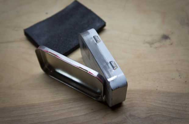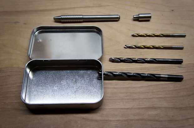 Finalmente nos taladre un agujero que voy a utilizar para fijar mi pluma. Aumentar el tamaño poco a poco para evitar rasgar la chapa lata del caso. Su podría prescindir de este paso completamente utilizando un lápiz más pequeño que cabe dentro de la caja... Quería mina sobresale como parece interesante... no todos los útiles ya que tengo que desarmar mi pluma cada vez que necesito usarla pero no voy para facilidad de uso aquí:).. .looking cool compensa usabilidad en este proyecto.