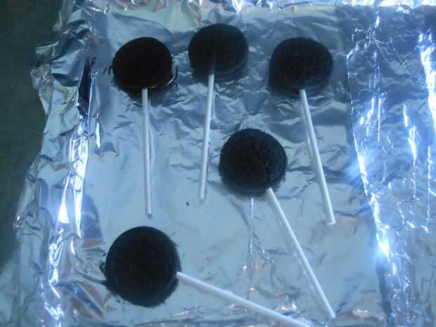Sumergir el palo de ventosa en el chocolate derretido y luego pegarlo entre las capas de las galletas Oreo.  Poner la galleta en el palillo sobre la hoja.  Dejar hasta que duro.