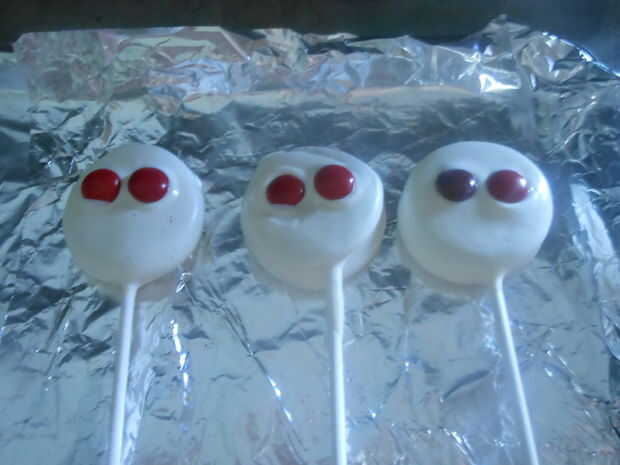 Agregar rápidamente los dos M & M para los ojos rojos.  Que emprenden el contador hasta que el chocolate se seque totalmente.  Esto puede tomar hasta una hora.  Si usted quiere acelerar, ponerlos en la nevera hasta que cuaje (15 minutos).