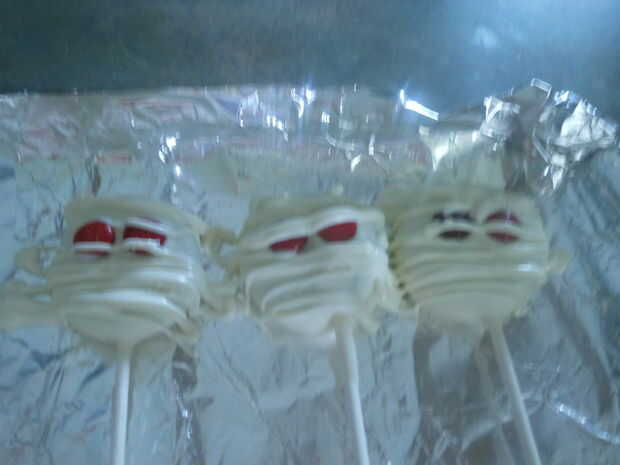 Si es necesario, re derretimiento derretimientos blanco.  Con una cuchara rociar mover el blanco se funde sobre la cocinera y aun los ojos para crear la envoltura alrededor de la momia.  Permiten los derretimientos.