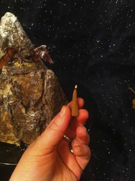 Si usted hizo conos, sólo uno de luz y coloque sobre la placa. Coloque la montaña sobre el incienso encendido y esperar unos segundos. El humo perfumado picante debe venir flotando de boca de Smaug.