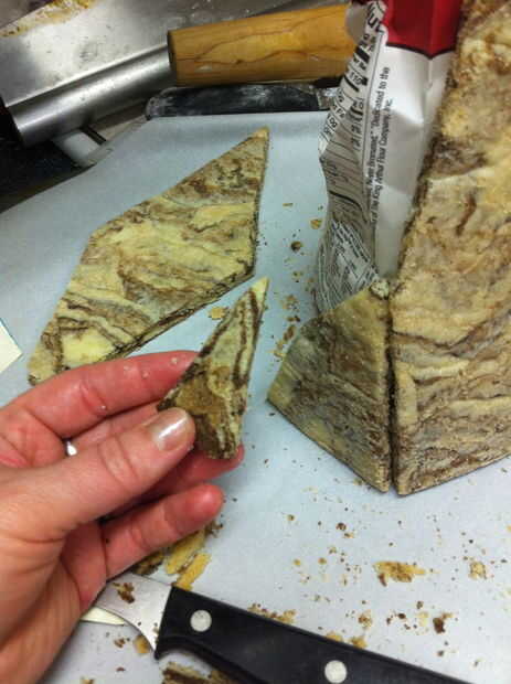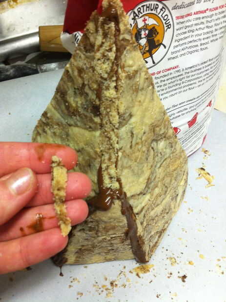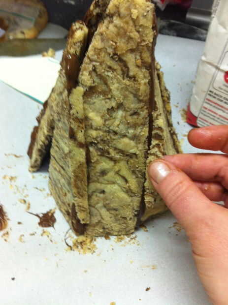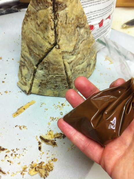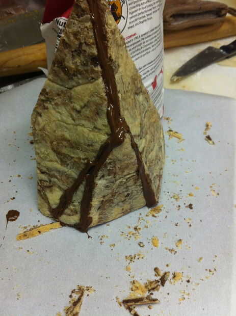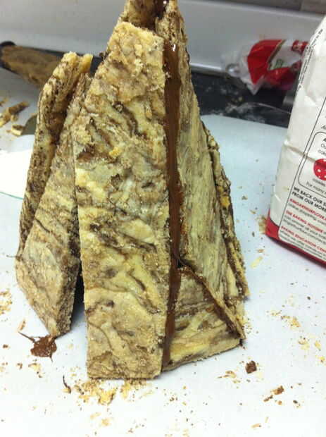 Una vez que has montado una parte decente de la montaña, probablemente notará que las costuras gruesas de chocolate son muy sensibles. Está bien, hombre. Encontrar las lonchas finas de cookie de biselar los bordes. Que va todavía a trabajar si ellos se desmoronaron un poco. Coloque las astillas de éstos sobre las costuras de chocolate. Todo esto se verá mucho más equilibrado las costuras no serán y no deben ser totalmente invisibles, pero ahora te parecen pertenecen a la montaña de la galleta entera.