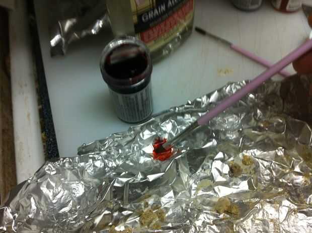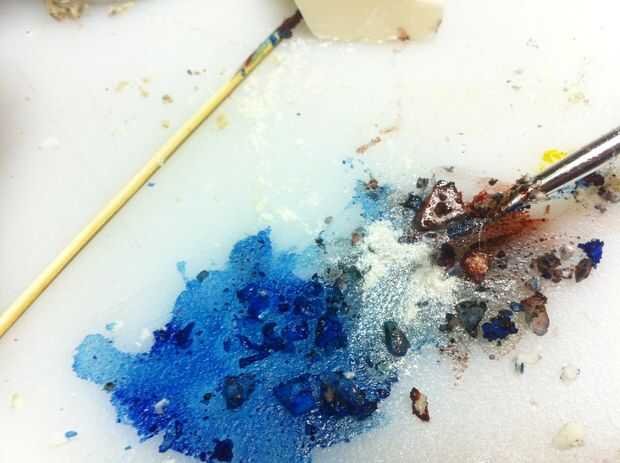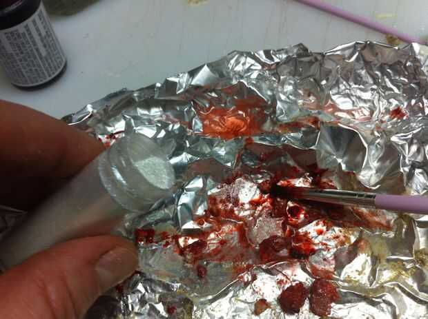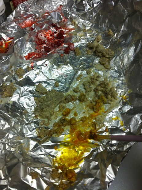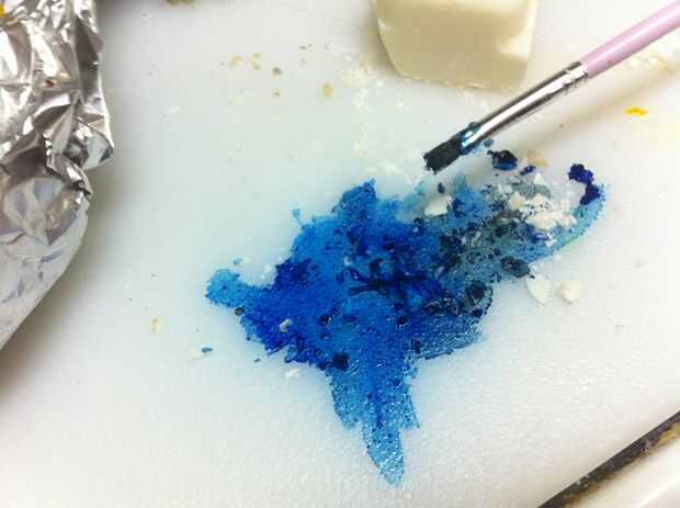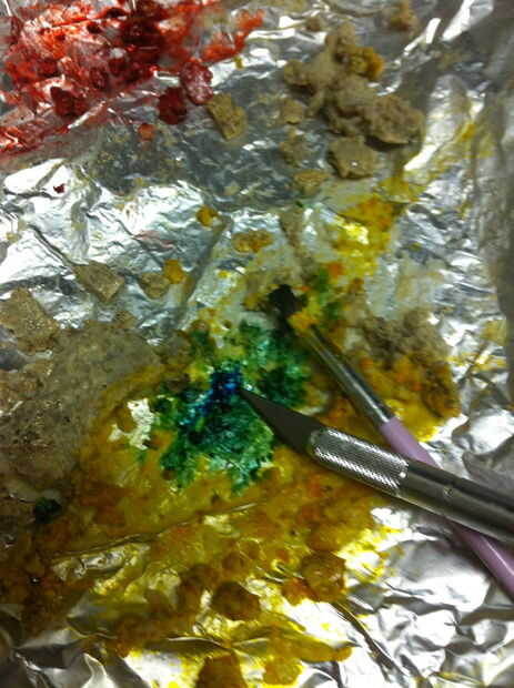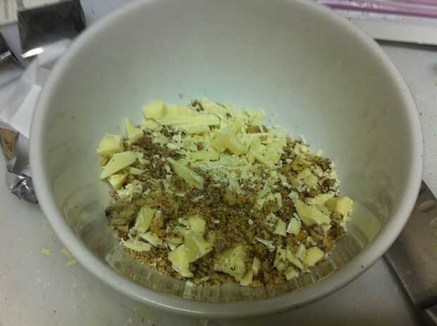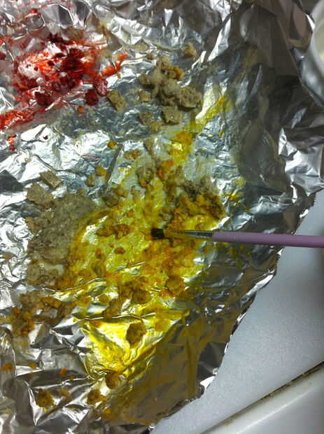 Derretir un chocolate blanco. Mezclarlo con algunas migajas de galleta... sobre migas de galleta de 1 T 2 T chocolate blanco. Difunda hacia fuera en papel de aluminio y congelarlo para enfriarlas rápidamente. Desmenuzar para arriba en pedazos pequeños. Everclear un poco de la mezcla con colorante alimenticio. Pintar la galleta de chocolate blanco pedacitos de migas con el alcohol teñido. Espolvoree polvo brillo en ellos. Encuentra el tesoro migajas a un lado para secar un poco.