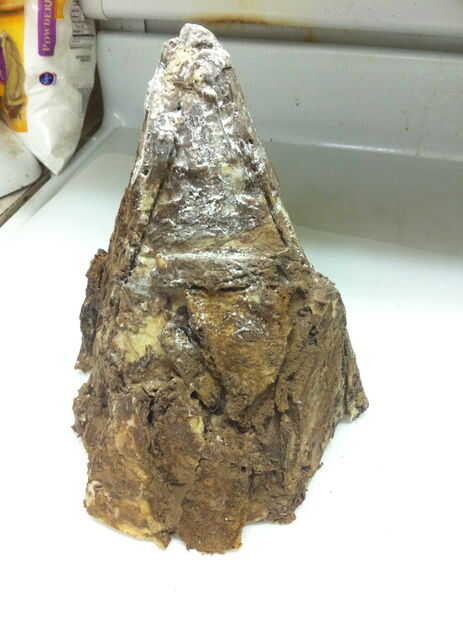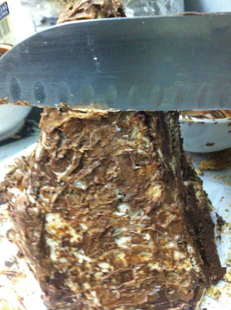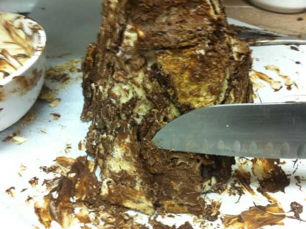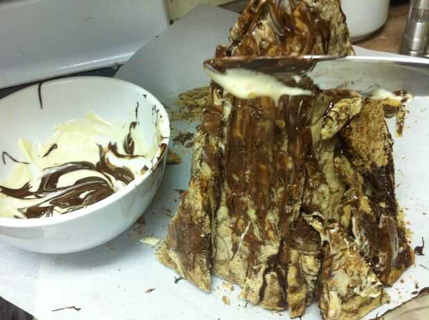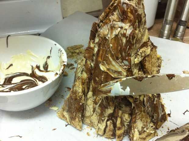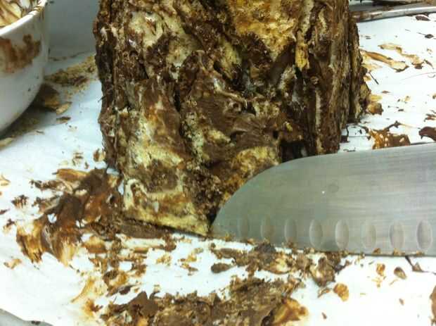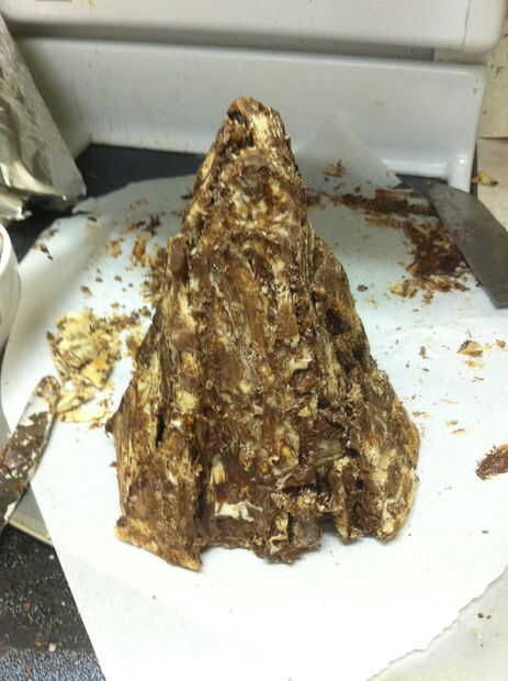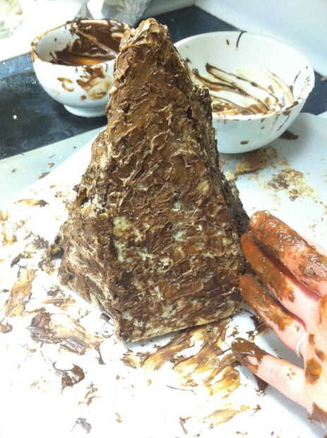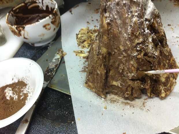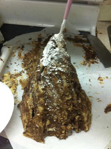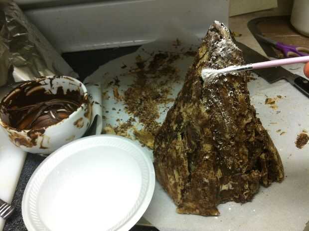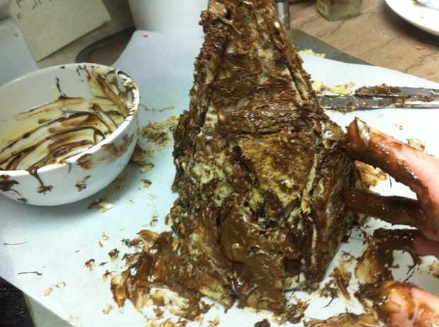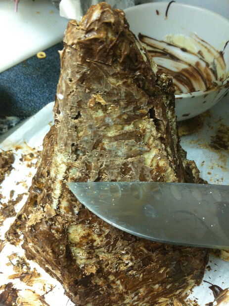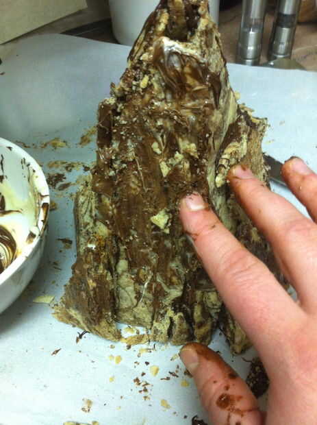 Ojala su botella del aerosol había una niebla muy fina Ajuste por lo que hay ahora no gotas de agua en toda la montaña. Blot apagado si hay. Tomar un cuchillo y cuidadosamente afeitado del chocolate sobrante de los lados de la montaña, permitiendo que más de la cookie de mármol para mostrar a través de lugares.