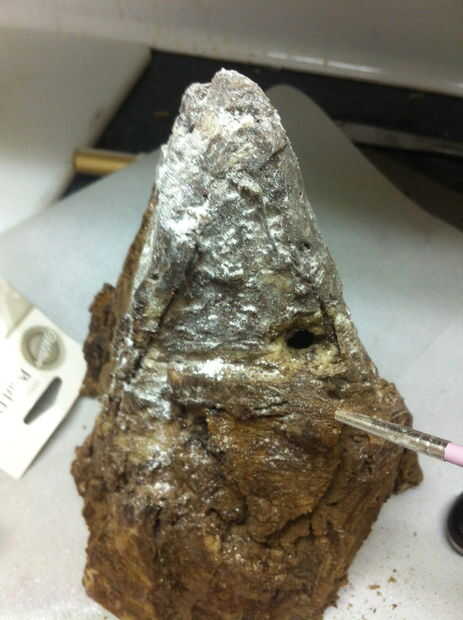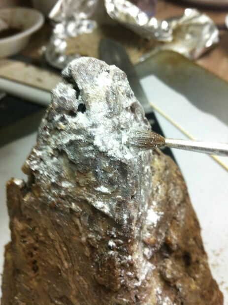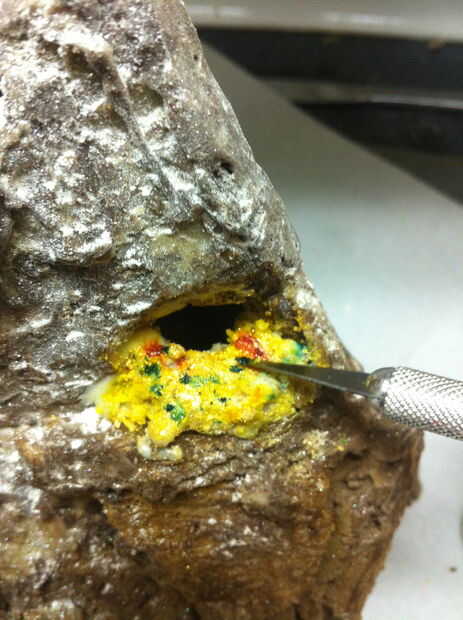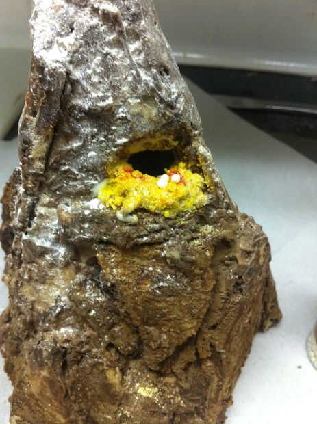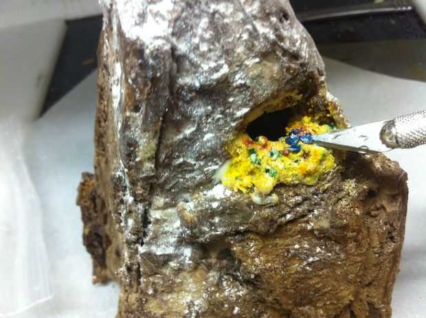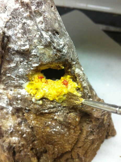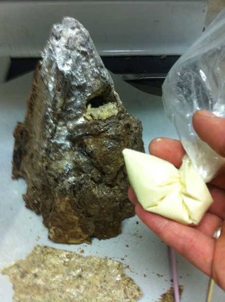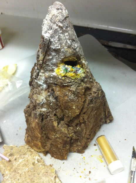 Utilicé chocolate blanco derretido para unir el tesoro a un pequeño saliente en la montaña. Si no construyes uno, usted puede hacer un muy rápido con una astilla de galletas o un pegote de chocolate. Sé, lo sé, que ni los enanos ni Smaug habría guardado el tesoro visible sobre una repisa. Sí, es tonto... pero no pude hacer que funcione todo bien con tener una vista en corte de la montaña y un montón de tesoro. Ocuparse de ella.