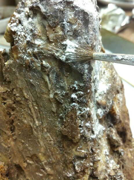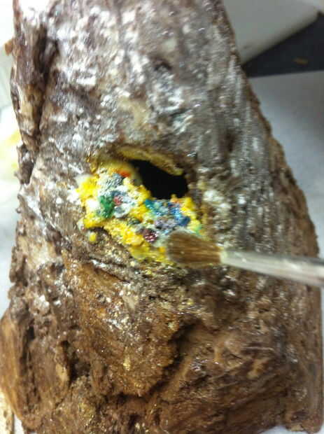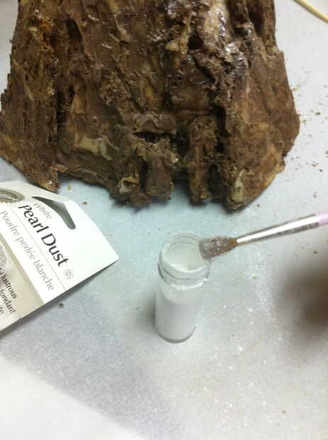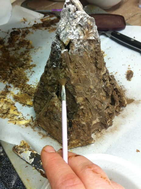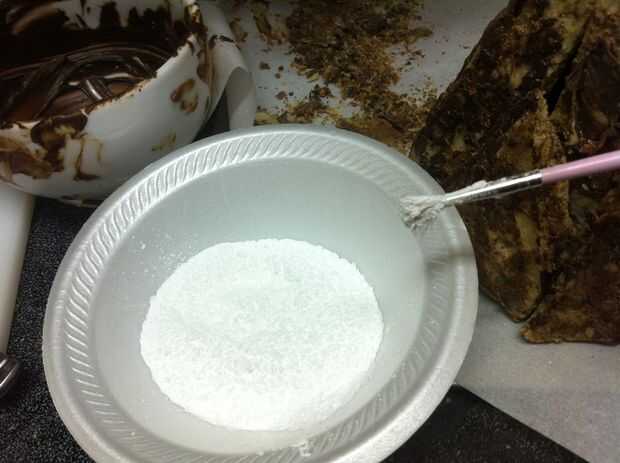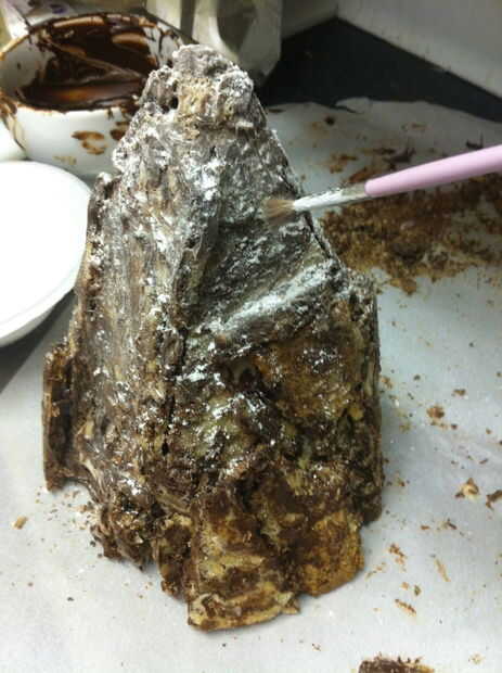 Algunas partes de la montaña todavía pueden parecer un poco demasiado brillantes. Sumerja un pincel suave en cacao en polvo y ligeramente cepille estas áreas para oscurecer y opacarlos. Limpie su cepillo y sumerja en azúcar en polvo. La cima de la montaña de polvo con azúcar en polvo para darle un aspecto Nevado. Probablemente tendrás que retocar posteriormente el azúcar en polvo, pero es bueno añadir una capa de base por ahora.