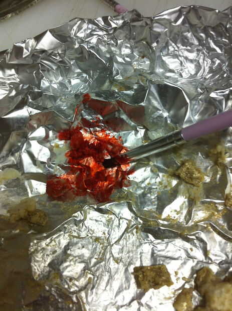 Use la hoja para unir los pedacitos del tesoro para el chocolate blanco sobre el borde. Añadir polvo lustre al tesoro para que se vea brillante. Decidí parecía mejor que tesoro sobre todo amarillo cubierto con polvo de brillo dorado y algunas piezas al azar de tesoro rojo, azul, verde y púrpura que parecen joyas.
