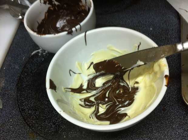 Fundir más chocolate blanco. Derretir el chocolate oscuro, demasiado... Yo diría sobre una onza de cada uno. Usted puede ponerlos dos en el mismo recipiente después de que están completamente derretidos y revuelto; no quiero mezclar para un color uniforme liso. Usando un cuchillo de mantequilla o dedo o lo que sea puedes tener a mano, unte un poco chocolate oscuro y blanco en el lado de la montaña. Raspar en los lados así algunas cookie sigue mostrando a través del chocolate no es muy grueso. Recuerde dejar algo sin mezclar el chocolate así que hay algunas variaciones de tono. Continuar a hacer esto por toda la montaña, asegurándose de no cubrir todas las galletas hermosamente jaspeado horneados.