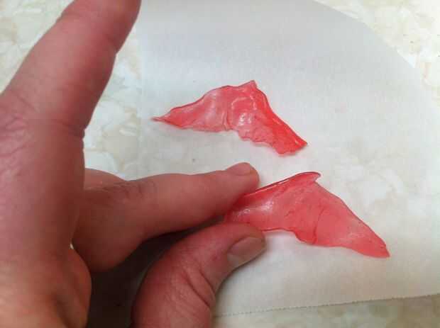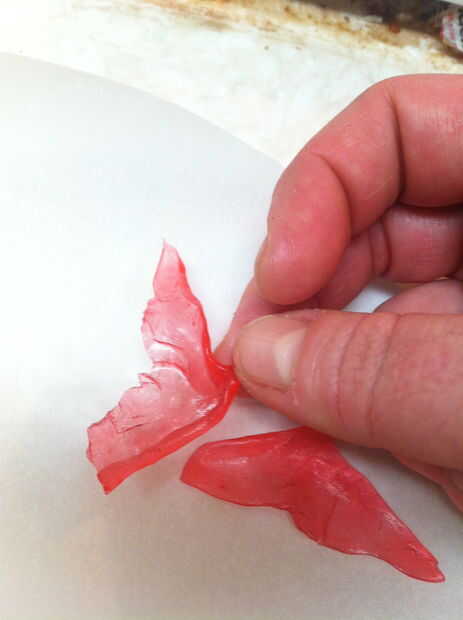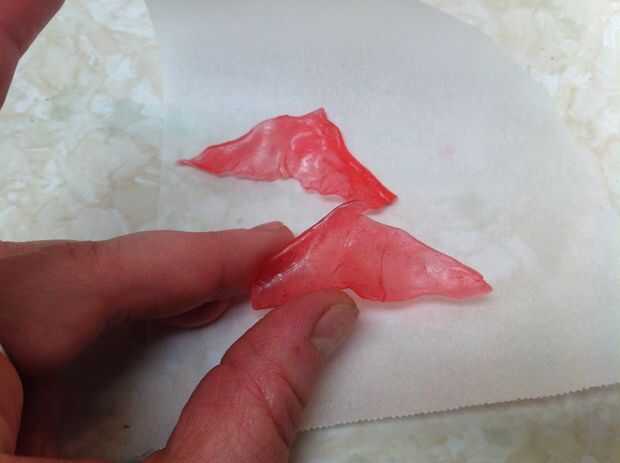 Vierta el azúcar caliente sobre un papel antiadherente o pergamino. Separar dos globos para las alas. Utilizar un pincho para suavemente poke ellos en forma de triángulo más o menos la forma de alas. Levante uno de los globos y suavemente separe los bordes - hacer esto lentamente como los artesanos que hacen caramelo de barba de dragón. Si vas rápido, se romperá el caramelo.