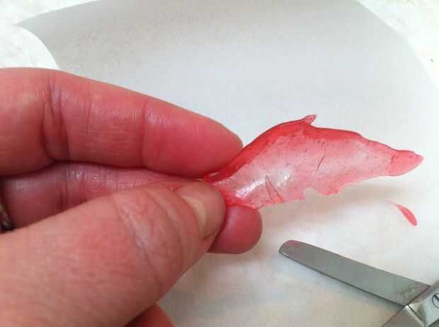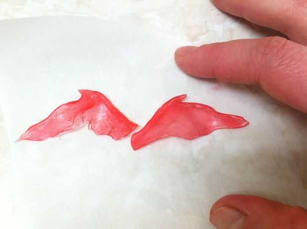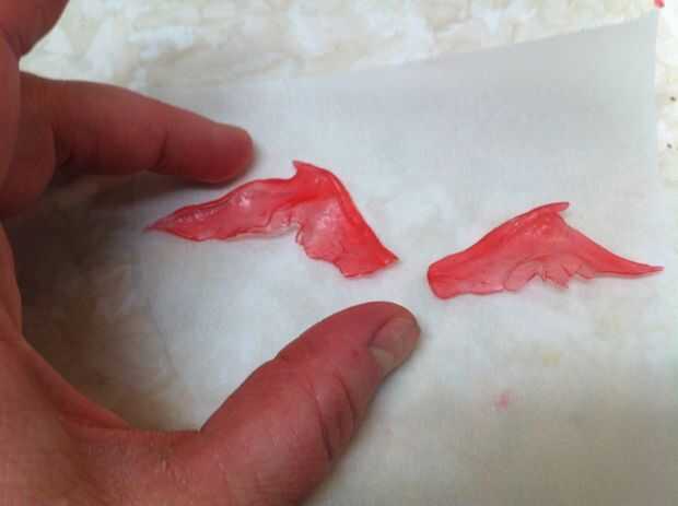 No sé de una técnica sólida para explicar. Sólo mantenía las alas de la calefacción, fijación desordenado, tirando y pellizcos hasta aproximadamente la forma que quería. Tenía algunas pequeñas tijeras para cortar los bordes de las alas, pero se mantuvo haciendo añicos. Traté de mantener el azúcar grueso en la parte superior del ala (que soporta el ala y se une al dragón de nuevo) y tira delgada y claro para las membranas. Pellizque un poco gancho en el empalme angular en el apoyo del ala.
