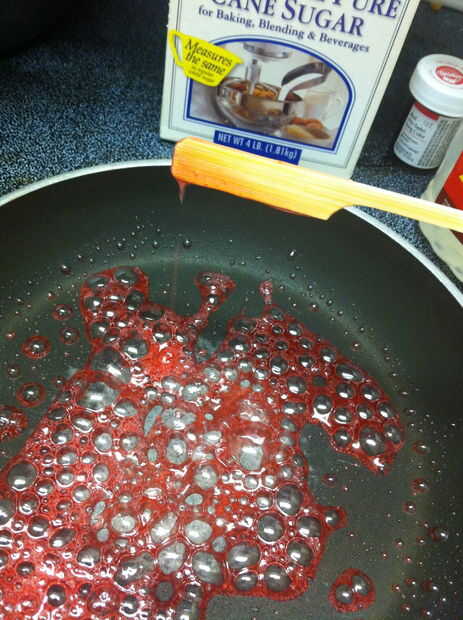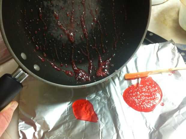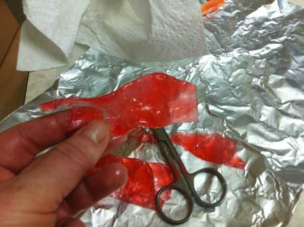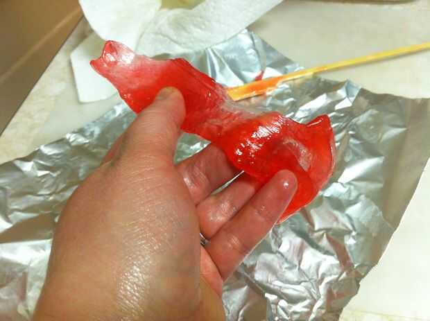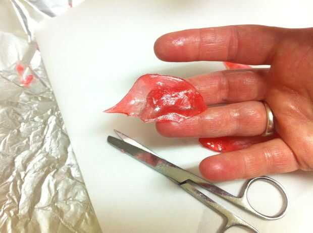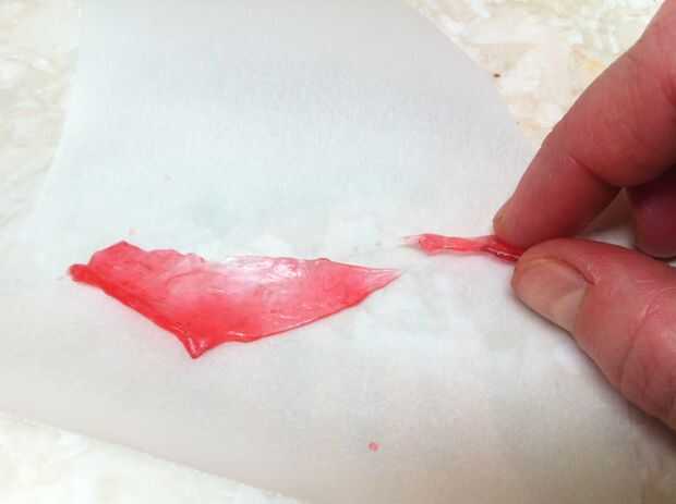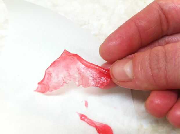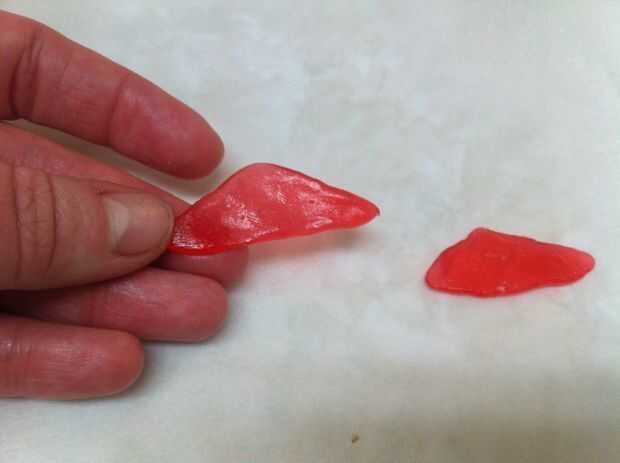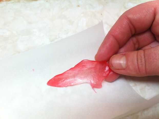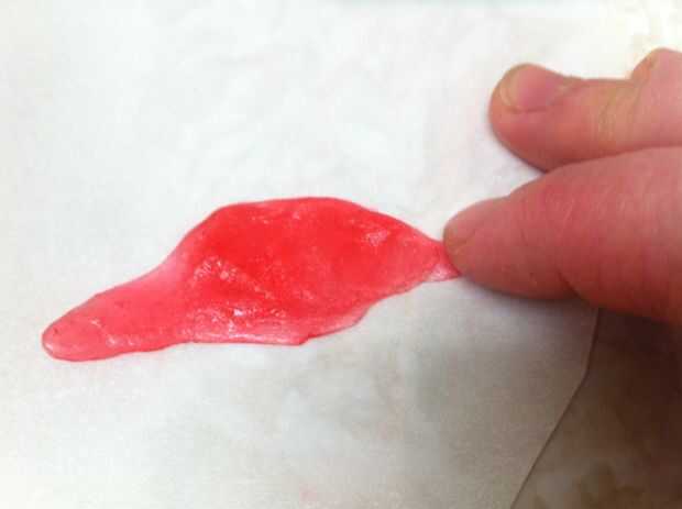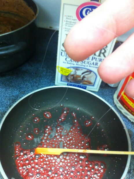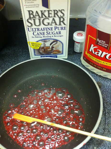 Derretir dos cucharadas de azúcar con una cucharada de jarabe de maíz, una cucharada de agua y tres gotas de rojo colorante en un recipiente. Revuelva a menudo. No use un termómetro de caramelo para esto; es una cantidad demasiado pequeña.