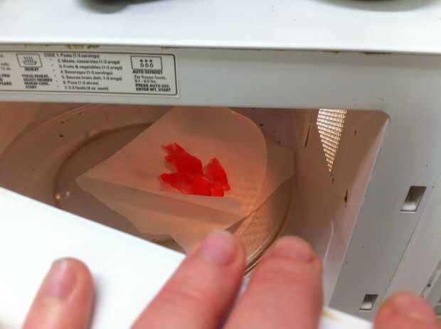 El azúcar se endurece mientras se enfría. Cuando esto sucede, coloque el pergamino y microondas 5 segundos, no más que eso. 7 segundos me dejó con una piscina de burbujeante de azúcar roja en mi pergamino.