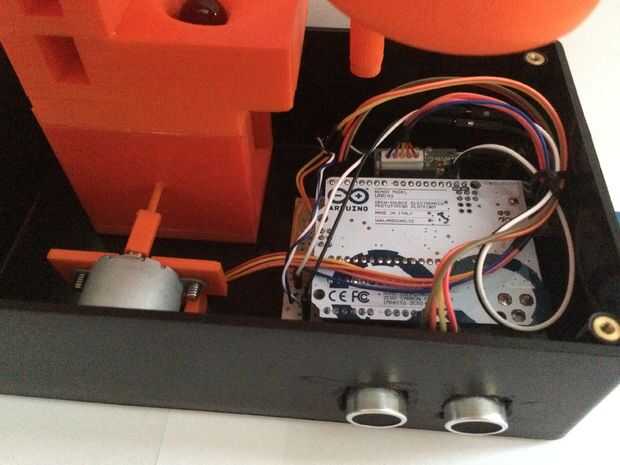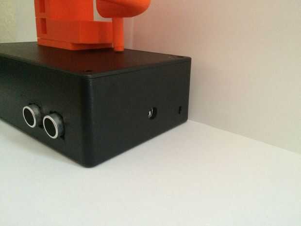 Esta caja se utiliza para albergar todas las piezas 3D, así como todos los accesorios para este proyecto. La parte superior de esta caja o puede recortar o 3D impreso (hacer el decodificador editado). Todas las piezas 3D y componentes de hardware deben encajar dentro de la caja como se muestra en la imagen. Sin embargo deben hacerse antes de finalizar este proyecto cuatro cortes: uno para el interruptor, uno para el cable USB y dos para el sensor de proximidad. Organizar todos los componentes de una manera similar como se muestra en la imagen y medida donde debe hacer sus cuatro cortes. Luego perforar o cortar las secciones de tamaño apropiadas.