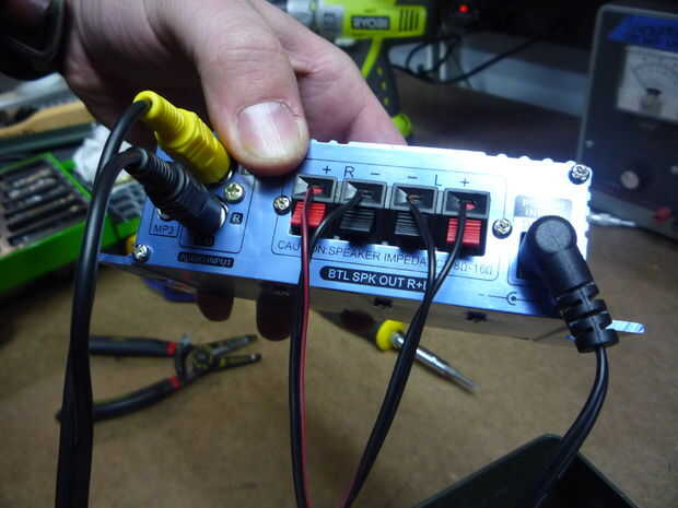 Ok, todo el trabajo duro se hace, es fácil rodando desde aquí en.  En este paso sólo va a ser enchufar los cables necesarios en el amplificador.