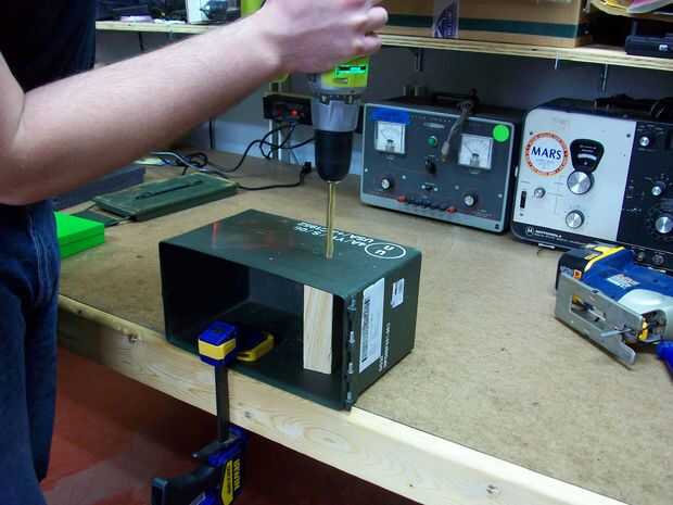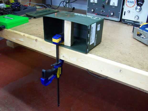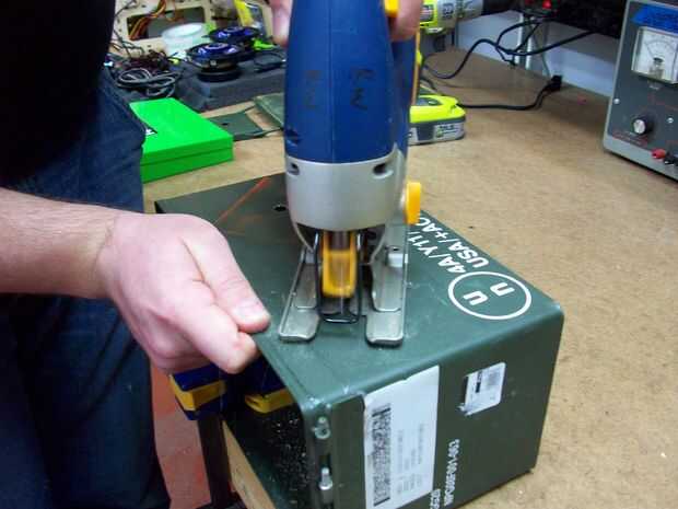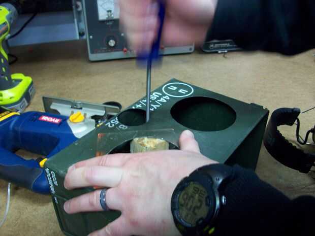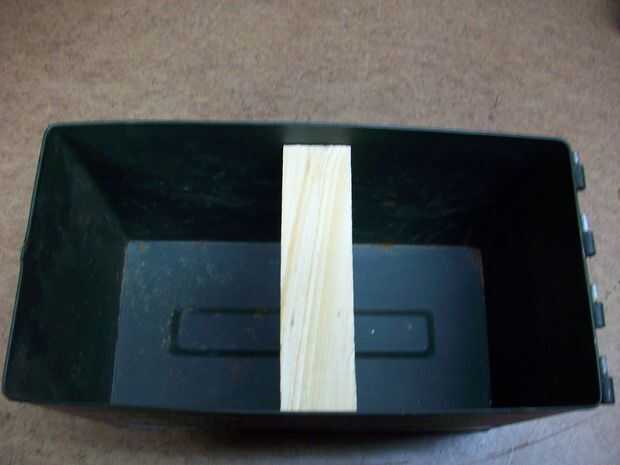 Lo primero es poner en las gafas de seguridad para que no pierda un ojo. Necesita cortar un pedazo de madera apenas el tiempo suficiente para que encajen entre los lados de la caja (ver foto). Esto evitará que el metal vibra violentamente durante el proceso de corte.