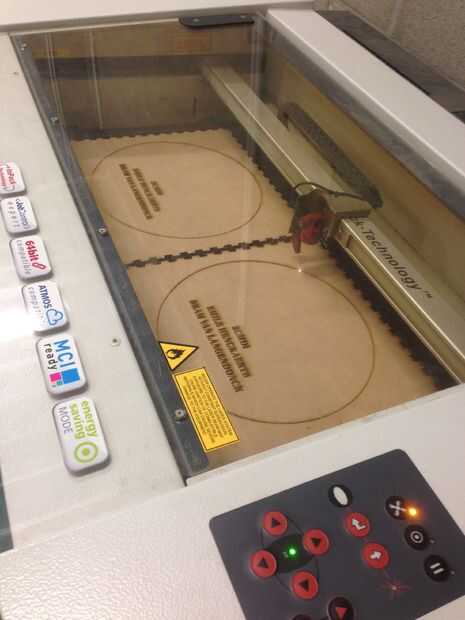 Se utilizó un lasercutter para crear las 2 cajas (los platos), las cubiertas superior y los ejes de transmisión. Utilizamos la página web MakerCase.com para crear una bonita caja con ensambles de dedo.