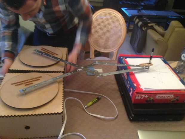 Nuestros ejes de transmisión, o brazos, probamos muchos diversos materiales. La clave aquí es encontrar un equilibrio entre la fuerte (no flexible) y material ligero. Finalmente utilizamos palos de madera poco. Al final se utilizó una pinza para la ropa, que nos sujeta. Adjunto nuestra pluma en la pinza para la ropa y utiliza una goma elástica para asegurarlo.