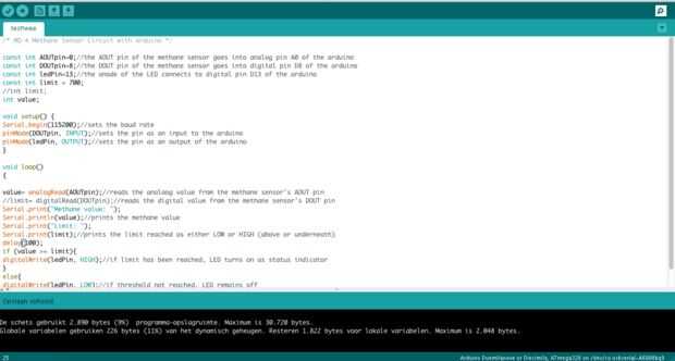Cuando el Gassensor detecta gas el LED debe parpadear. Utilizando un código de Arduino puede hacer que este principio de trabajo. Si desea leer las mediciones de la gassensor tienes que mirar en 'Seriele monitor' en Arduino. Cambiando el valor límite, el LED va a reaccionar diferente. En nuestra situación el sensor de gas medidos en condiciones normales alrededor de 250-350. Cuando aplicamos un poco gas el valor saltó. Así que elegimos el límite para poner en 400.