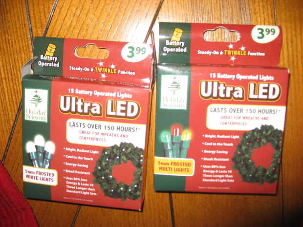 2. cadena de luces LED de pilas. Yo tengo la mía de Walgreens. Son $4, o están a la venta todo el tiempo para 3 / $10. Los comprados el año pasado tuve 20, 2 mm claro, LED. Son muy luminosas y añadir un brillo agradable. Fueron accionados por 4 AA y funcionará continuamente durante días. La venta este año son 15, color de agua, 5mm, LED, funciona con 2 AA. Se ejecutará durante 4 días en un juego de baterías. El 2 AA es bueno porque hace que el sombrero más claro y también hace más fácil esconder el paquete de baterías.