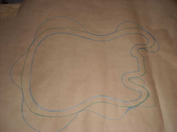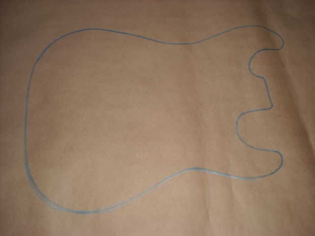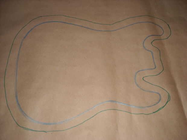 Ahora vamos a trazar la forma de la guitarra en el papel/cartón. Después de haber terminado el trazo dibuja otra línea de 1" a de la primera. Esta línea representa el grueso de la guitarra. La siguiente línea se basa de la segunda línea que hicimos. Para esta línea queremos dibujar algunos golpes al azar va hacia el exterior. Estos serán las piezas doblar sobre el borde de la guitarra a virar en su lugar.