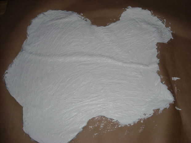 Una vez que todas las líneas han sido dibujada go ahead y vacía el tubo entero de masilla en parte las líneas. Entonces usando lo que está alrededor de tirar la masilla a las líneas externas. Usé mis manos y una toalla para ayudar a darle alguna forma. Cualquier forma que agregas ahora se mostrará más adelante bajo el látex en forma de piezas más gruesas / diluyente, agregar al efecto.