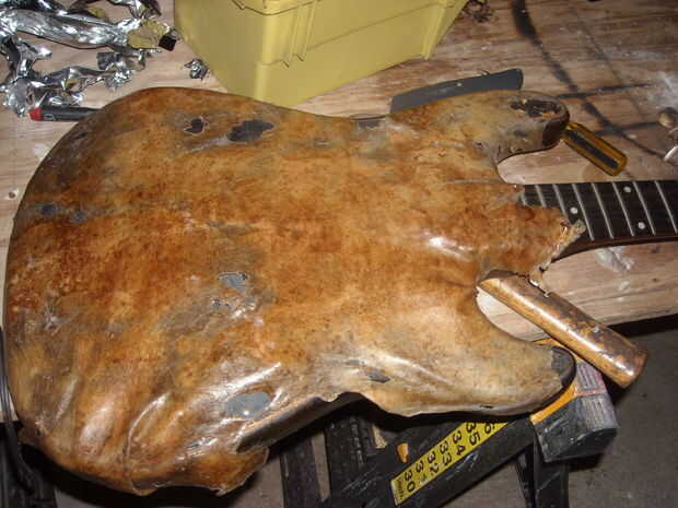 Con la guitarra vuelve a montar y el látex separados, ahora podemos empezar a colocar la "piel". Iniciar mediante pequeños clavos o chinchetas para sujetar el látex en la parte posterior de la guitarra a paño. como usted trabaja su manera alrededor de extracción del látex apretado. Sugerencia: el látex se rasga así plegar bajo la uña. También, cuando tienes las uñas a medio camino en golpeó lateralmente para dobla algunos de látex unpunctured. Esto es donde se puede utilizar pegamento para ayudar a aliviar el estrés en el látex.