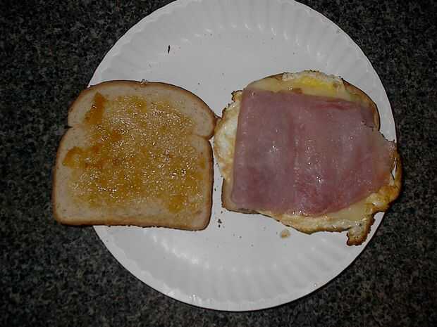 Jamón. Añadir el jamón a su compilación, ligeramente cociné minas en una estufa en la misma sartén que yo había hecho mi huevo, para que sea calentado.
