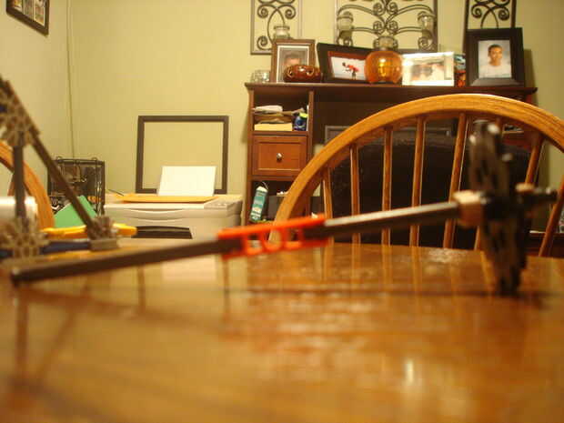 he hecho una ballesta cool que puede disparar +-150 pies.No tiene un gatillo como las otras porque me enteré que se puede utilizar toda la potencia de la ballesta luego.Utiliza las ruedas de repartir el poder en las bandas de goma para hacerlo dispar