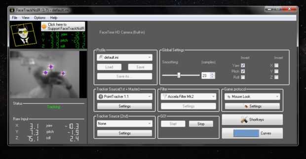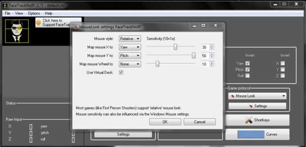 - Ahora puede ajustar la configuración para FaceTrackNoIR a tus preferencias. Se refieren a la imagen de arriba para obtener un ejemplo de qué configuración se puede utilizar.