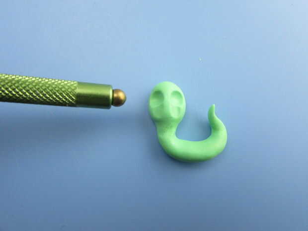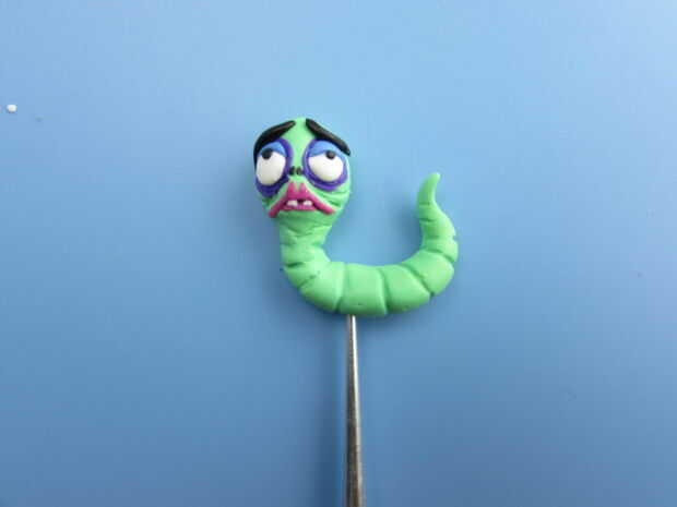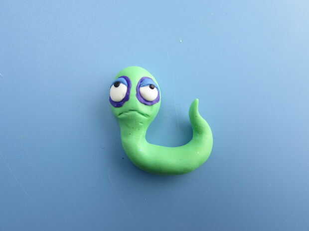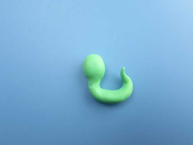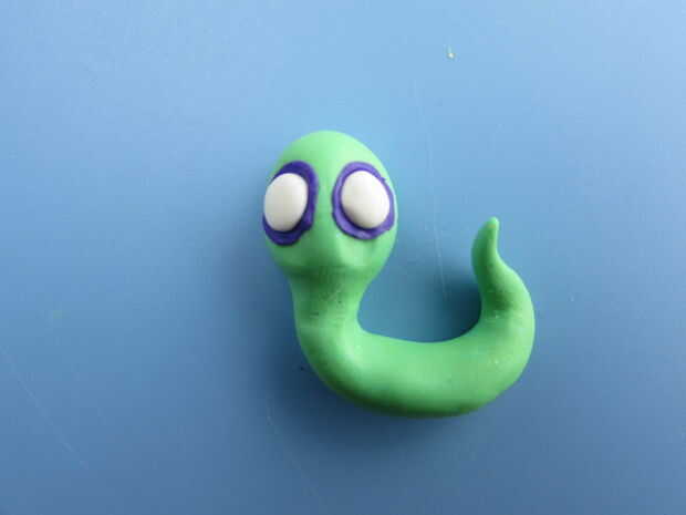 Empezar por dar forma a la arcilla de color verde amarillo en un registro de 2 pulgadas largo con un extremo afilado. El sujetador de 1/2 de pulgada desde el otro extremo para crear el cuello del gusano y luego plantear el gusano con su cola hacia arriba.