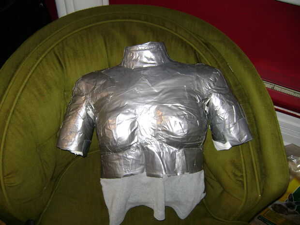 Retire la cinta de conducto simulada. Si no resbale fácilmente de los brazos se puede hacer recta corta a lo largo de las mangas.