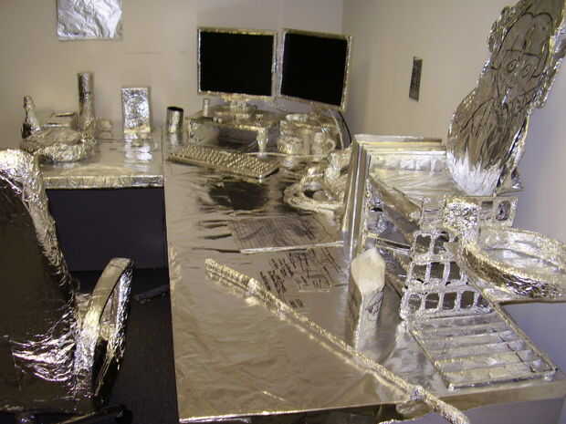 aquí está un pequeño escritorio con una silla, el escritorio es aproximadamente una pulgada de largo. Incluso viene con varios accesorios apuntarle... quien se sentará en este escritorio. Perfecto para un edificio de oficinas pequeñas. Podría hace