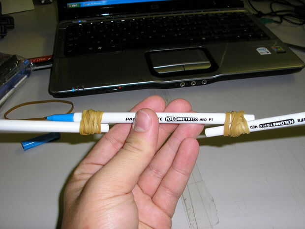 obtener dos de las tres plumas kilométricas y una de las grandes bandas de goma y atar las dos plumas kilométricas a hacen lo mismo con el otro lado