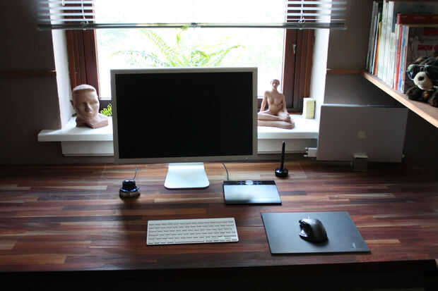 Algo que es todavía un trabajo en progreso es un cajón oculto colocado encima de la mesa. Esto tiene y oculta los tomacorrientes, hubs USB, discos duros, etc. etc. de enredos de cables.
