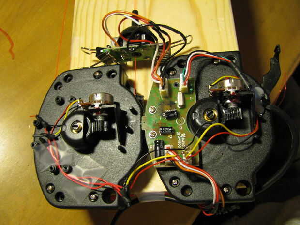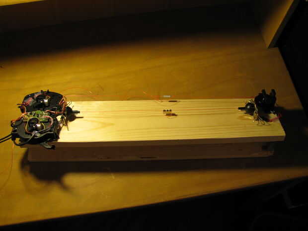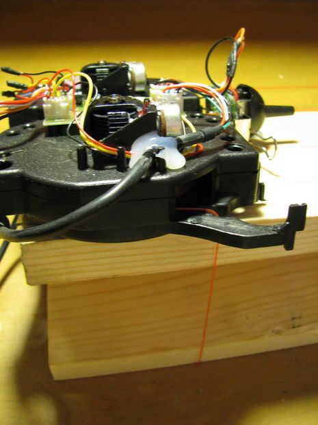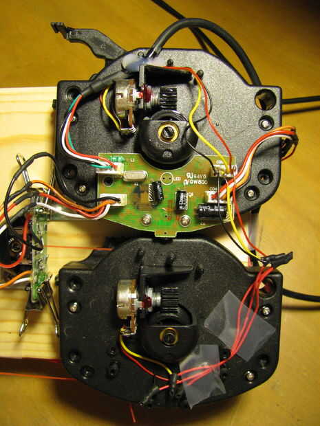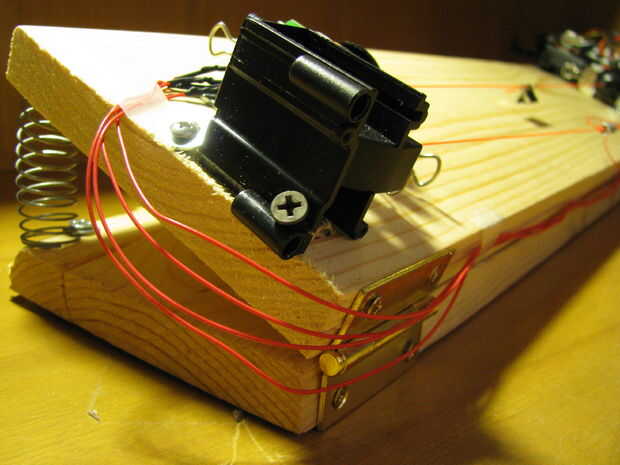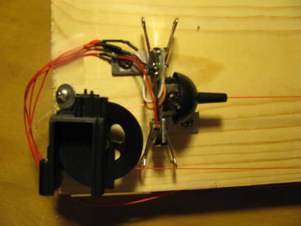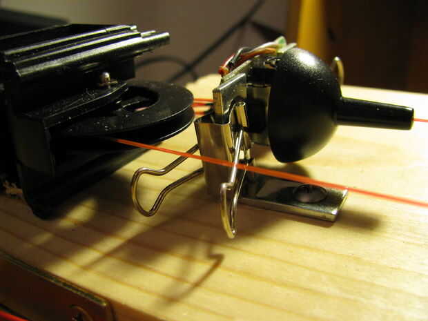 Los dos carretes y la polea fueron Unidos a la estructura una cinta muy pegajosa, de doble cara. Esto resultó para no ser suficiente para que la polea así que tuve que atornillar en la placa así. Si pueden idear una mejor manera de unir a la Junta que soportan las fuerzas laterales de la cinta, seguir en adelante. Acababa de usar las piezas que tenía a mi disposición. Si usted elige utilizar tornillos para madera como para la polea tenga cuidado de que los tornillos no dividió el plástico. La bobina secundaria debe estar en la parte posterior del instrumento con las dos aberturas hacia la longitud de la tabla. La bobina primaria debe ser en la parte delantera del controlador para que la apertura, con el accesorio de guía de alambre, sobresale sobre el borde del marco. Una vez que todos los componentes conectados a la estructura, tome el cable de la bobina primaria y Envuélvala alrededor de la parte inferior del marco. Os adjunto de nuevo alrededor de la bisagra, pero cualquier punto hará mientras mantiene el alambre envuelto alrededor de la parte frontal del controlador. Ahora, cuando usted presione el regulador, el cable debe viento nuevo en el carrete y luego volver otra vez cuando suelte el controlador.