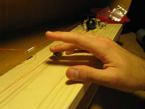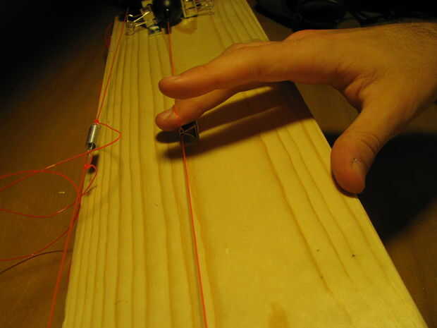 Luego, enrolle los extremos alrededor de las dos poleas. Para la bobina secundaria, puede considerar el uso de algún material en la superficie de la bobina para ayudar a sujetar al alambre de plástico suave. Usé una tira fina de velcro suave porque era lo que yo tenía por ahí, pero me imagino que algo de luz, goma flexible haría el truco muy bien.