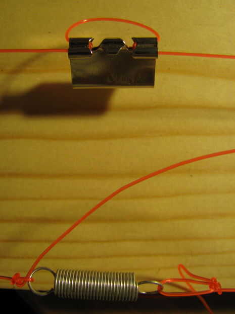 Una vez que tengas el cable enrollado alrededor de todo el aparato que vas a tener que atar juntos de nuevo. Esto es donde entra el resorte de pequeña extensión. Atando los extremos de la cinta a la primavera tire y empuje en la cinta a trabajar los dos joysticks. Asegúrese de que el punto donde hacer el resorte no limita la movilidad del anillo a lo largo del controlador. Querrá atar la cinta que es constantemente tenso, tan tenso que se estira el resorte, pero que la primavera se expandirá inmediatamente cuando comience a estirar la cinta hacia afuera. Como veis en la foto, he decidido no cortar el cable sobrante de plástico y en su lugar que se encuentran en la parte posterior del controlador. Como no se enrede con cualquier cosa, pensé que era mejor dejar en caso de que tuviera que volver a apretar la cinta.