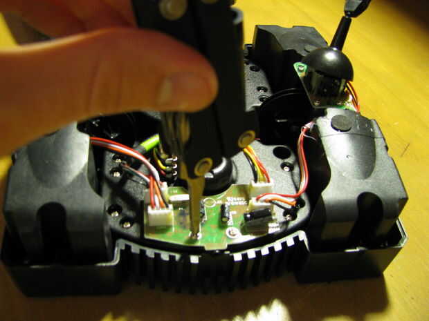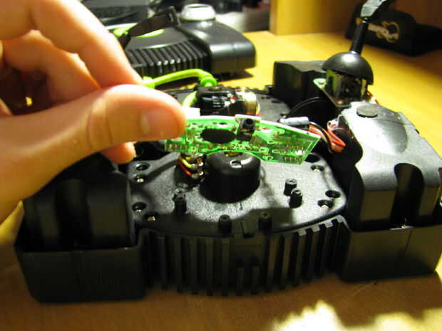 El Gametrak para enviar datos es uno de los pasos más simples, sin embargo, uno de los más frustrante si sólo estás esperando el dispositivo y la computadora inmediatamente comunicar. Primero, retire los dos juegos de tornillos y arandelas que conectan el cuadro eléctrico a la parte superior de la carcasa del carrete. Levante la Junta suavemente. En la parte inferior debe notar una gran cantidad de texto etiquetado de las distintas partes de la Junta. Por suerte, usted realmente no necesita entender todo esto.