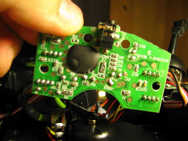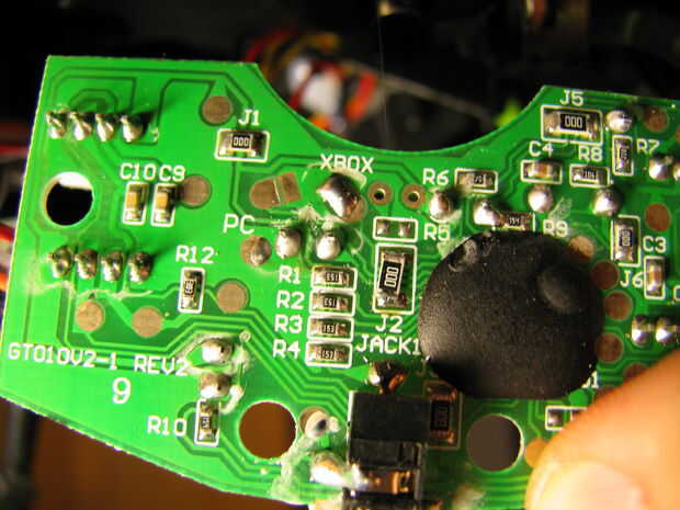 Las partes importantes son los denominados "PC" y "XBOX." Esos puntos de conexión de dos sólo necesitan un toque de soldadura para determinar la salida. Si el Gametrak, como el ilustrado, es de la variedad de X-Box, la conversión a HI no es demasiado difícil. Empezar por raspar de la soldadura en el punto de conexión del X-Box. Una vez que tenga quitar completamente Compruebe el punto de conexión de PC. Si i cubierto con una chapa de plástico, tome una hoja de afeitar y afeitar hasta llegar al metal, teniendo cuidado de no afectar a ninguna otra parte de la Junta. Luego, aplique un poco de soldadura que conecta los puntos de conexión de PC.