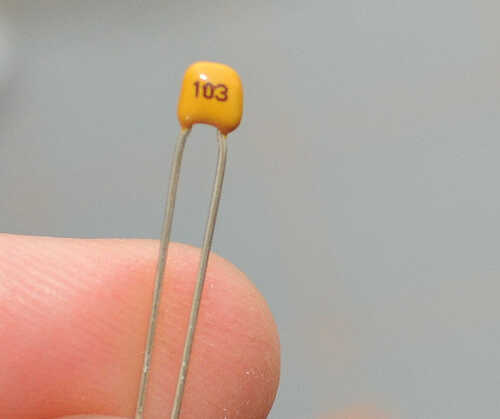 C6 se estabiliza nuestra tierra virtual, es un condensador de cerámica de .01uF. Una gorra de .01uF está marcada con el número '103'